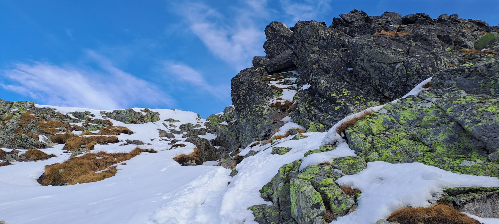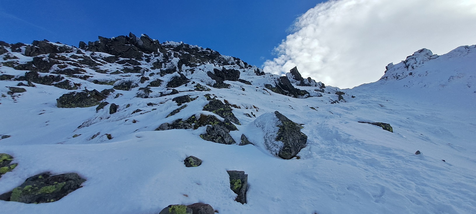 What I was carrying with me was still good enough for scaling places such as Priečne sedlo, a mountain saddle I was familiar with, but when trying to hike to Jahňací štít (2230 meters AMSL, the easternmost peak in the High Tatras), I soon discovered there was no chance getting to higher altitudes without crampons, an ice-axe and warm clothing, even ploughing my way through the piles of snow on not really steep terrain in Červená dolinka (literally “Red Valley”) had been a remarkable effort.