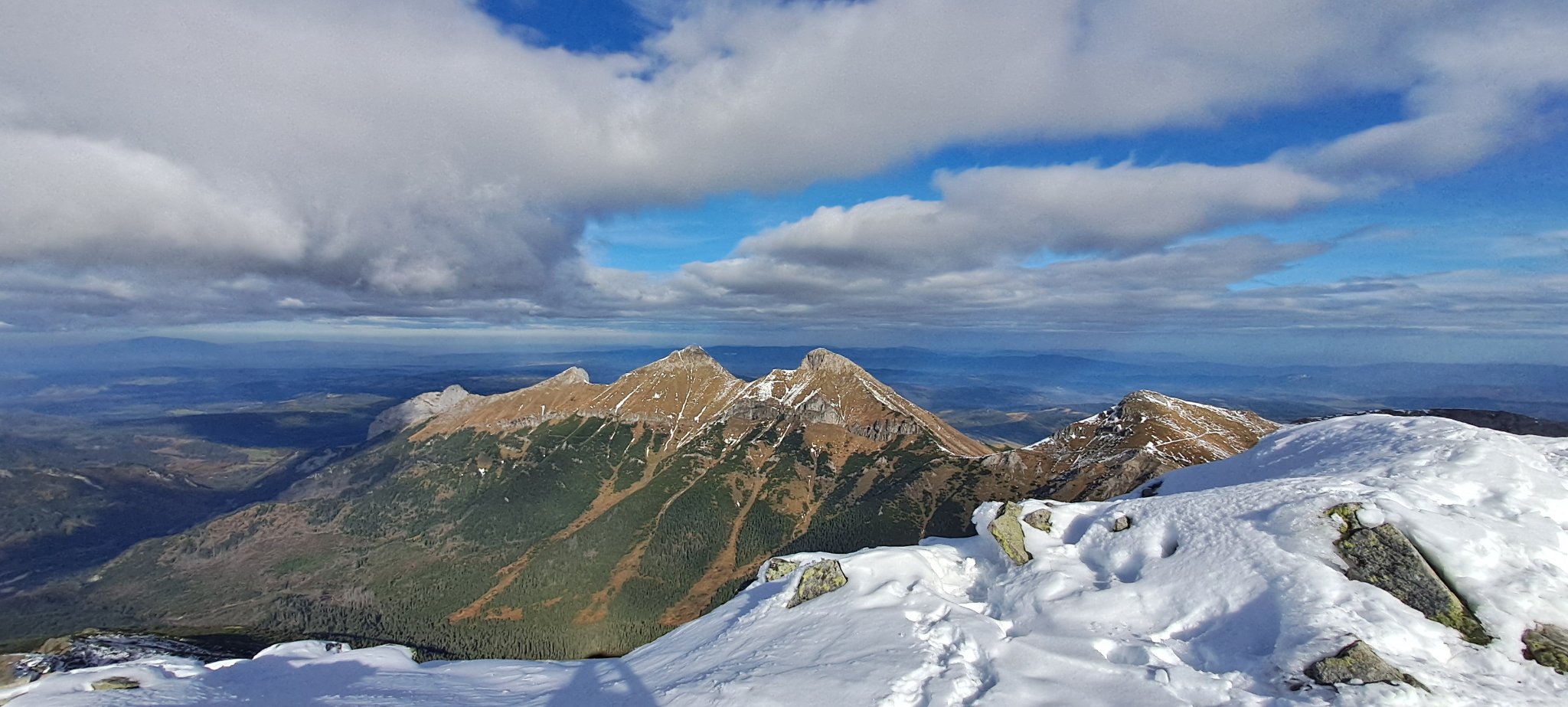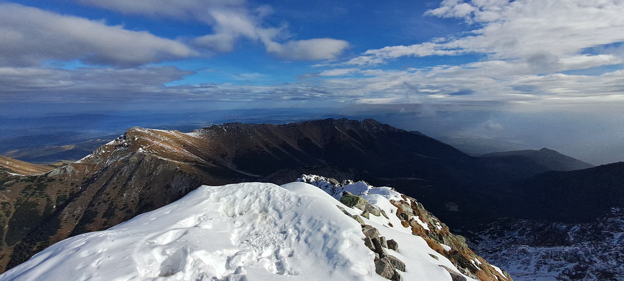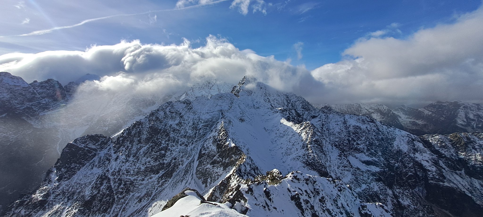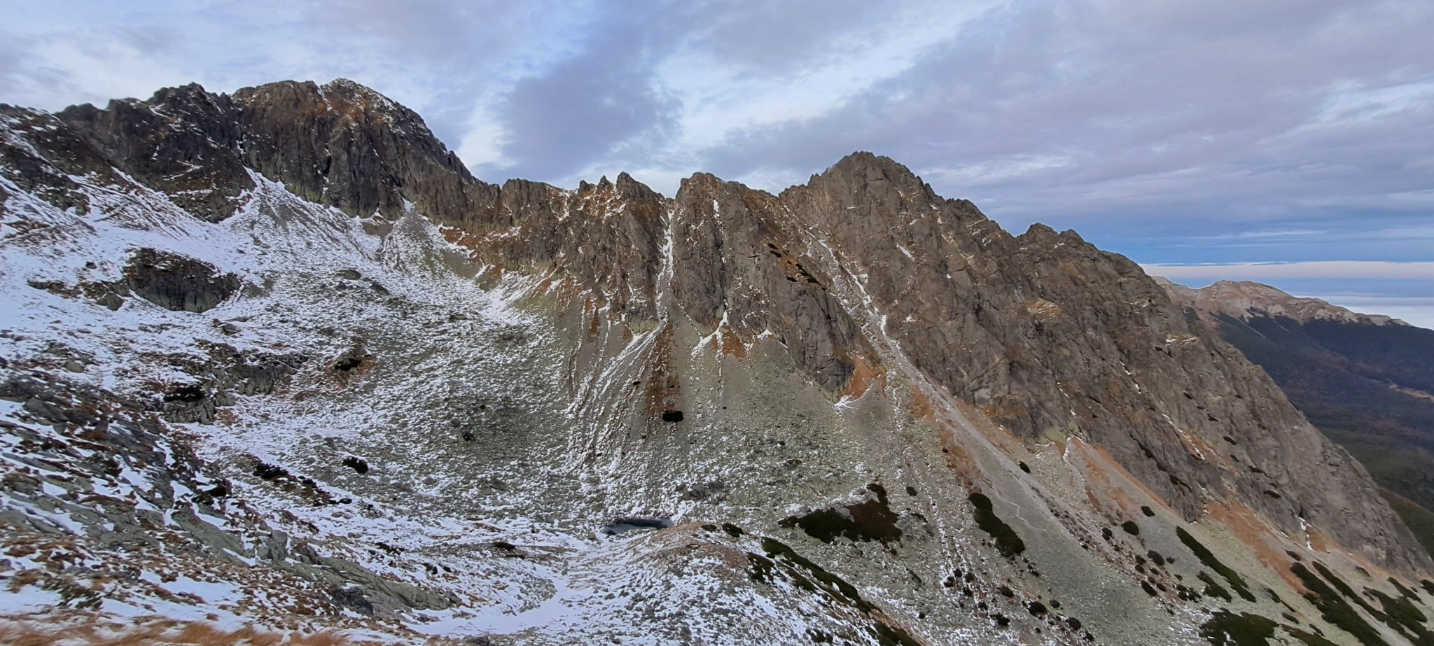 The clouds cleared as I finally reached the top after unwittingly making a detour on a snowy, almost vertical wall (very soft snow so it was not very difficult), what was a nice reward after toiling for three hours starting at Chata pri Zelenom plese (1551 meters).