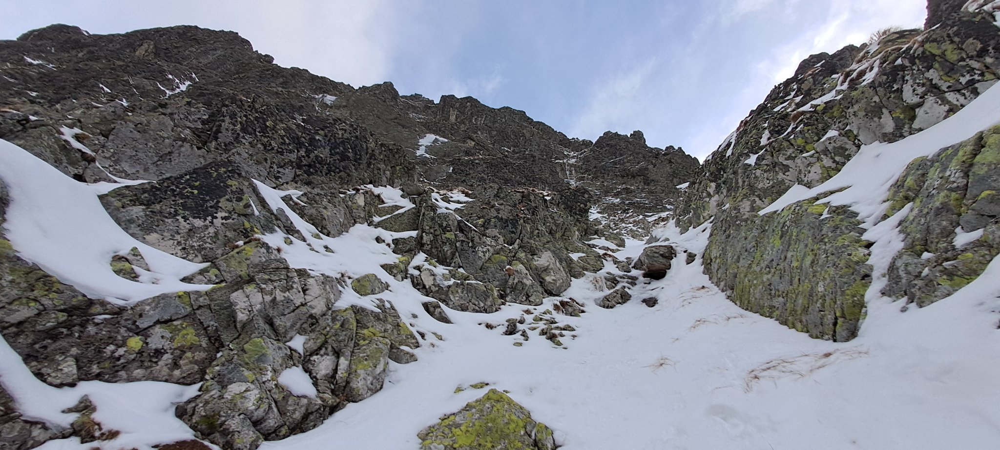 What I was carrying with me was still good enough for scaling places such as Priečne sedlo, a mountain saddle I was familiar with, but when trying to hike to Jahňací štít (2230 meters AMSL, the easternmost peak in the High Tatras) after crossing Červená dolinka (literally “Red Valley”), I soon discovered there was no chance getting to higher altitudes without crampons, an ice-axe and warm clothing, even ploughing my way through the piles of snow on not really steep terrain had been a remarkable effort.