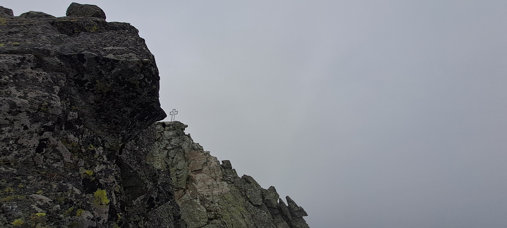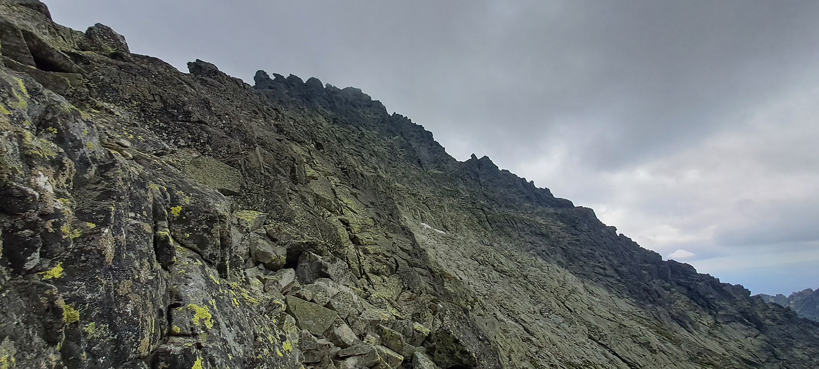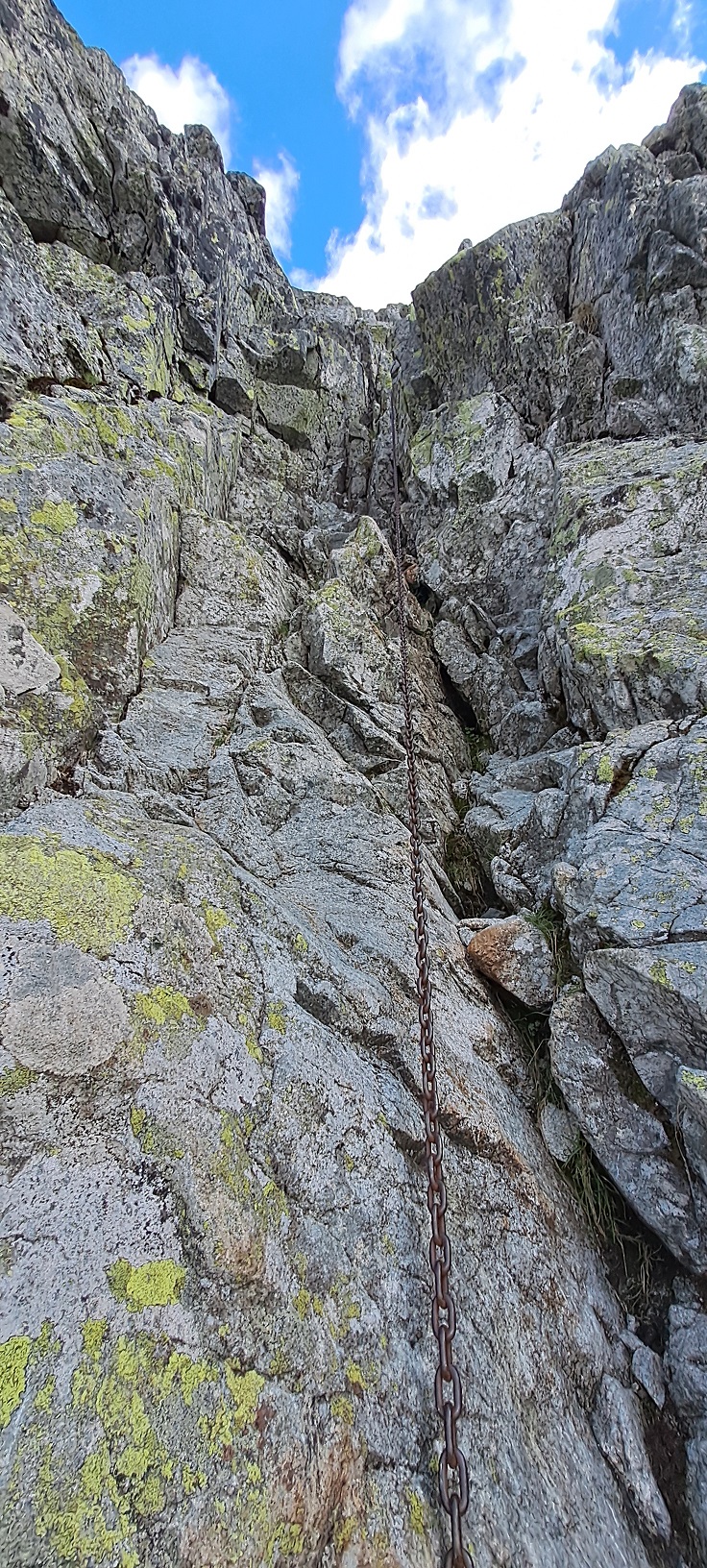 Moderately difficult climbing starting at sedlo Váha (2337 meters AMSL), yet in no place above UIAA II+ on the normal route in my estimation (and there is metal such as chains attached to the rock to make it easier).